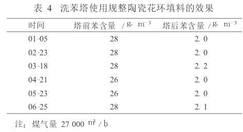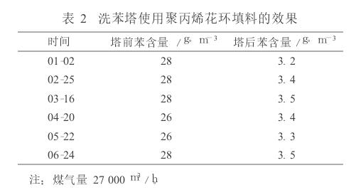 山西古縣一焦化廠 3 600mm× 3 000mm洗苯塔使用的是聚丙烯花環(huán)填料,裝填填料163m 3,配套600kt/a焦化項(xiàng)目,填料總造價(jià)26.08萬(wàn)元。自2004年12月投產(chǎn)至今,經(jīng)多次蒸汽吹掃后花環(huán)填料層明顯下沉,塔后含苯較投產(chǎn)初期高。 2009年洗苯塔前、后苯含量如表2