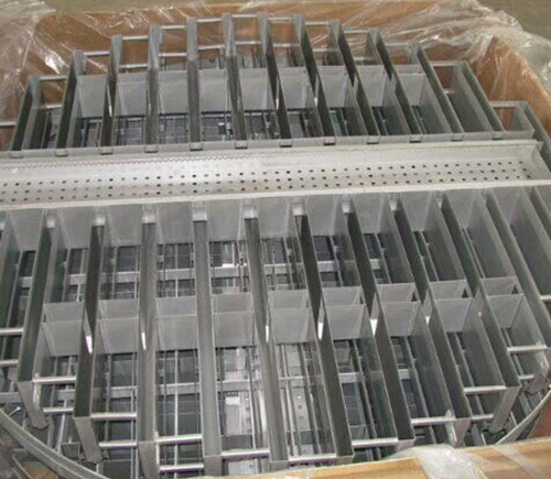 實現傾斜板對全截面的覆蓋,能夠對液體收集時提升收集效率,這是柵板式支承-收集-再分布器的最Z大優(yōu)點,但是對于上升氣流的干擾以及高度的增加,會導致其性能受到一定程度的影響。因此,應該采用合理的方式對柵板式支承-收集-再分布器進行改進。柵板支承絲網填料的過程中,液體受到上升氣流的影響,會通過塔壁四周流下。這是由于在網片中存在一定程度的毛細作用,加上上升氣流的上舉力作用,導致液體下落有在困難。為了有效對液體進行收集,需要采取合理的導流措施。為了便于液體分散落入分布槽中,可以將柵板下緣設計為鋸齒狀。液體沿內壁流下后通過集液環(huán)由環(huán)形槽收集。多孔型和溢流型柵板式支承-收集-再分布器的設計,能夠分別在小流量和大流量操作中提升工作效率。